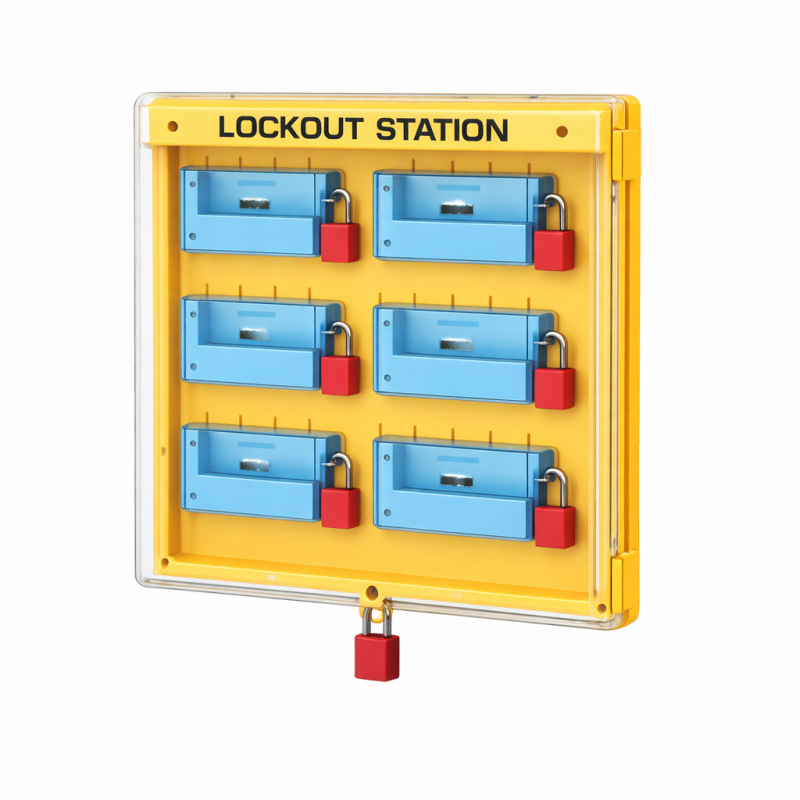 Станция закрытого типа для хранения LOTO замков с прозрачной крышкой. Вмещает 6 карманов для мобильных телефонов. Изготовлена из прочного пластика, закрывается на навесной замок. Станцию без крышки можно заказать под артикулом BD-B209W.