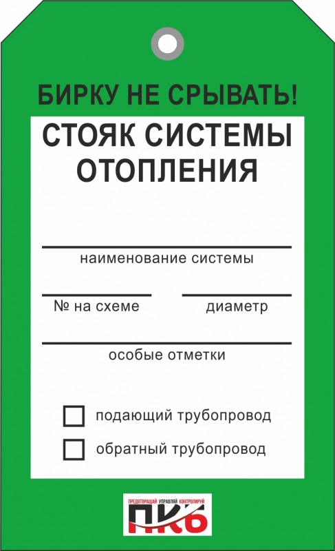 Информационная бирка "Стояк системы отопления". Изготовлена из пластика ПВХ, толщиной 0,3 мм, без ламинации, диаметр отверстия 7 мм. По желанию заказчика толщина бирки может быть увеличена до 1-2 мм. Нанесение текста необходимо производить маркером или шариковой ручкой. Размер 70 х 115 х 0,3 мм.