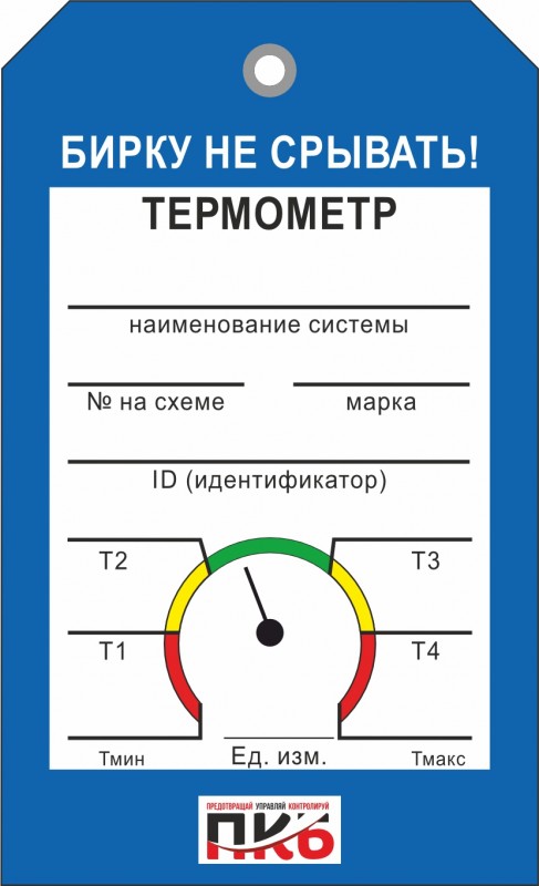 Информационная бирка "Термометр". Изготовлена из пластика ПВХ, толщиной 0,3 мм, без ламинации, диаметр отверстия 7 мм. По желанию заказчика толщина бирки может быть увеличена до 1-2 мм. Нанесение текста необходимо производить маркером или шариковой ручкой. Размер 70 х 115 х 0,3 мм.